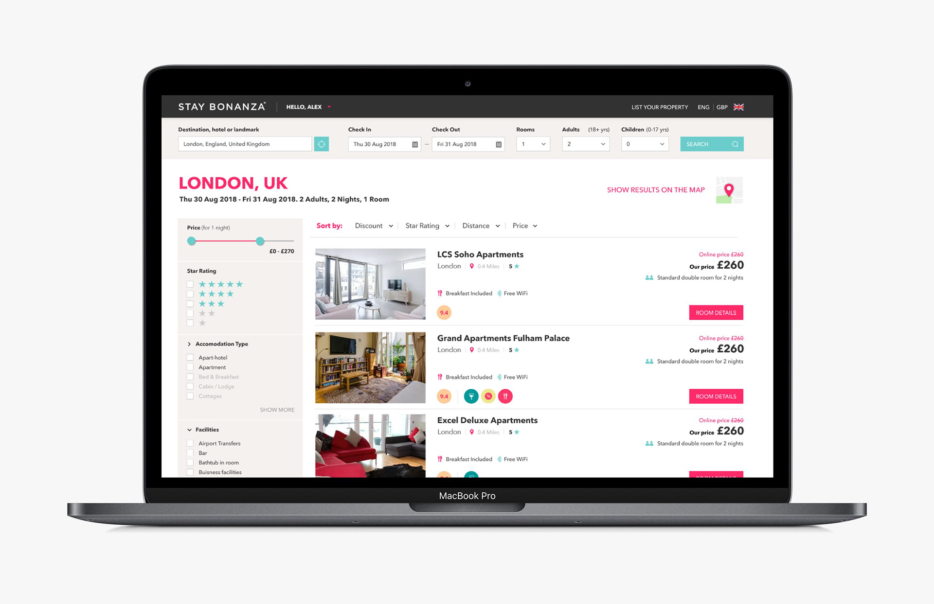 Corporate Identity, UX Design & Art Direction for this hotel booking portal.